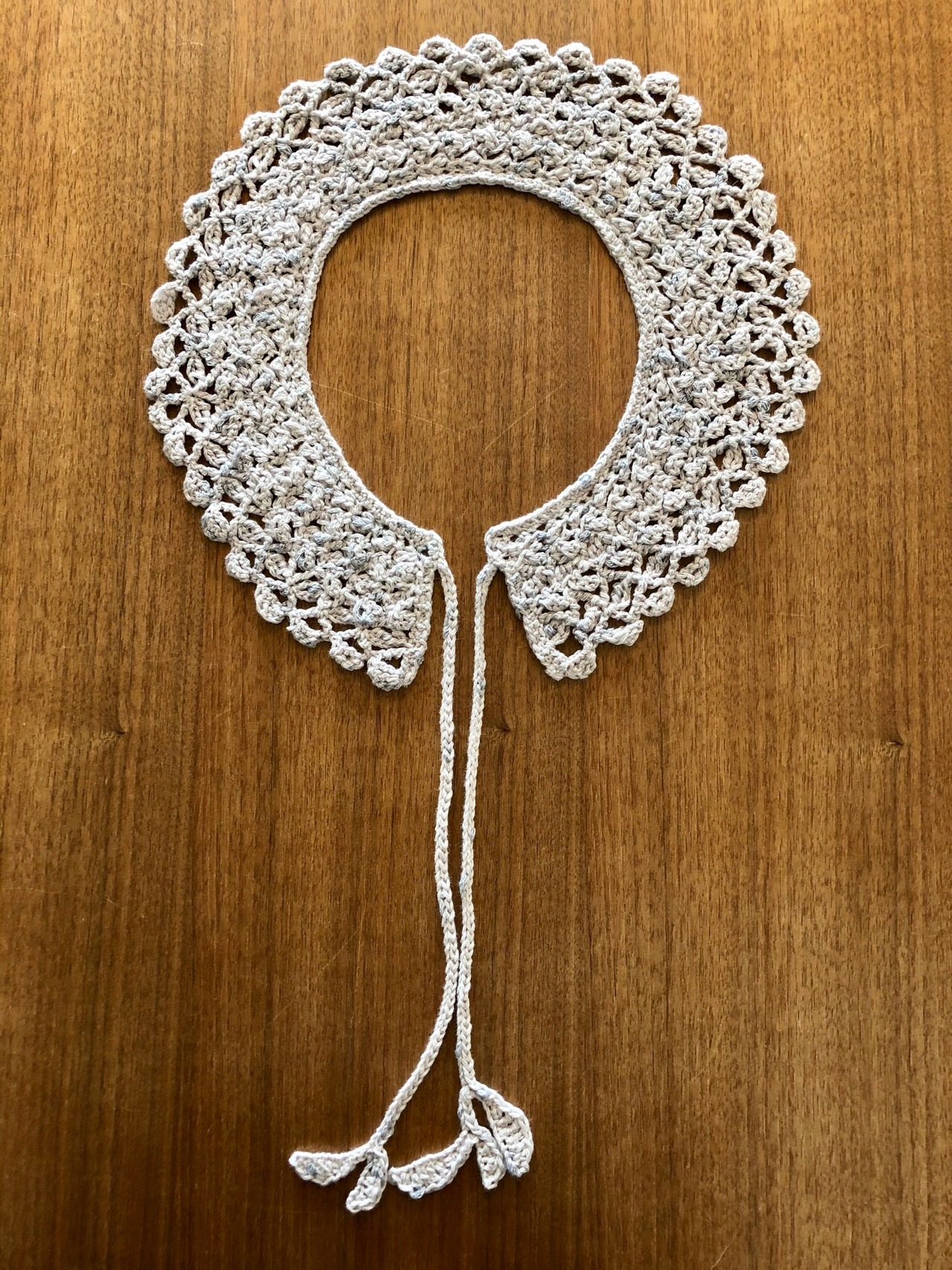 ◉内側から外側に向かって大きくなっていくフラップを、葉っぱのように編み込んだ付け襟。