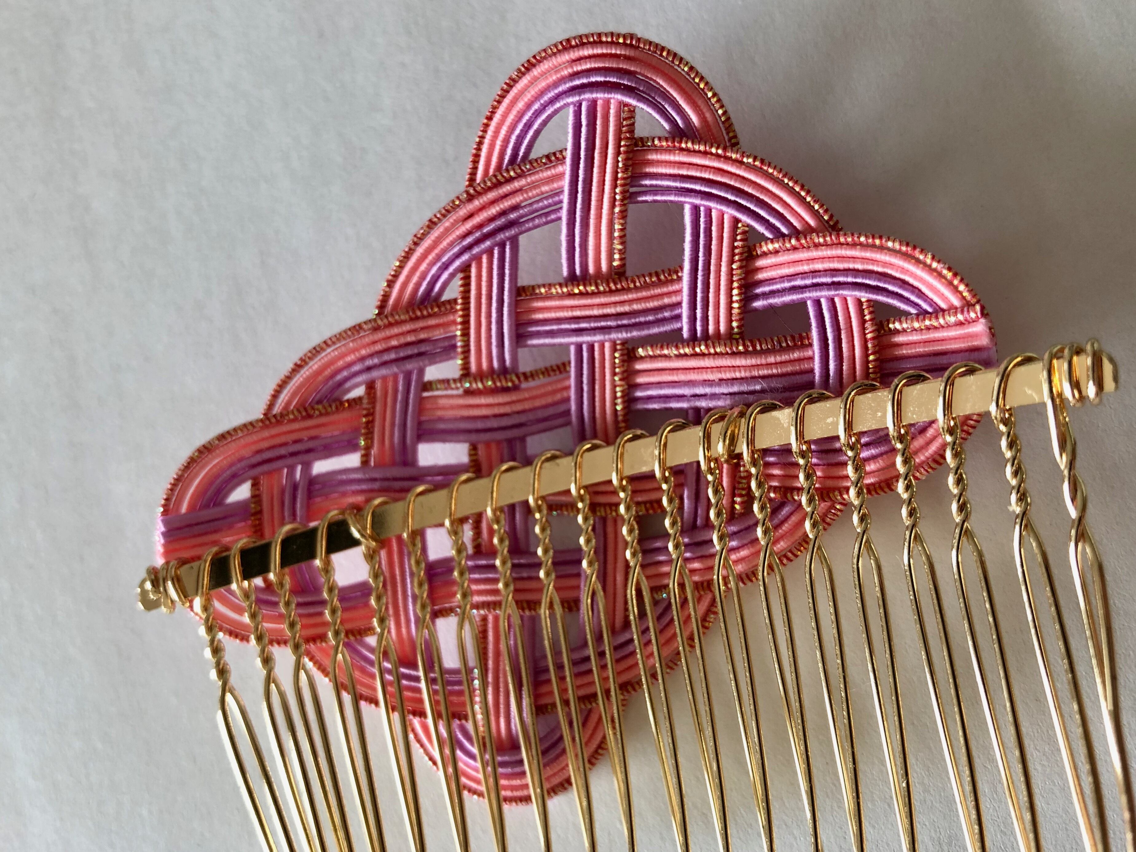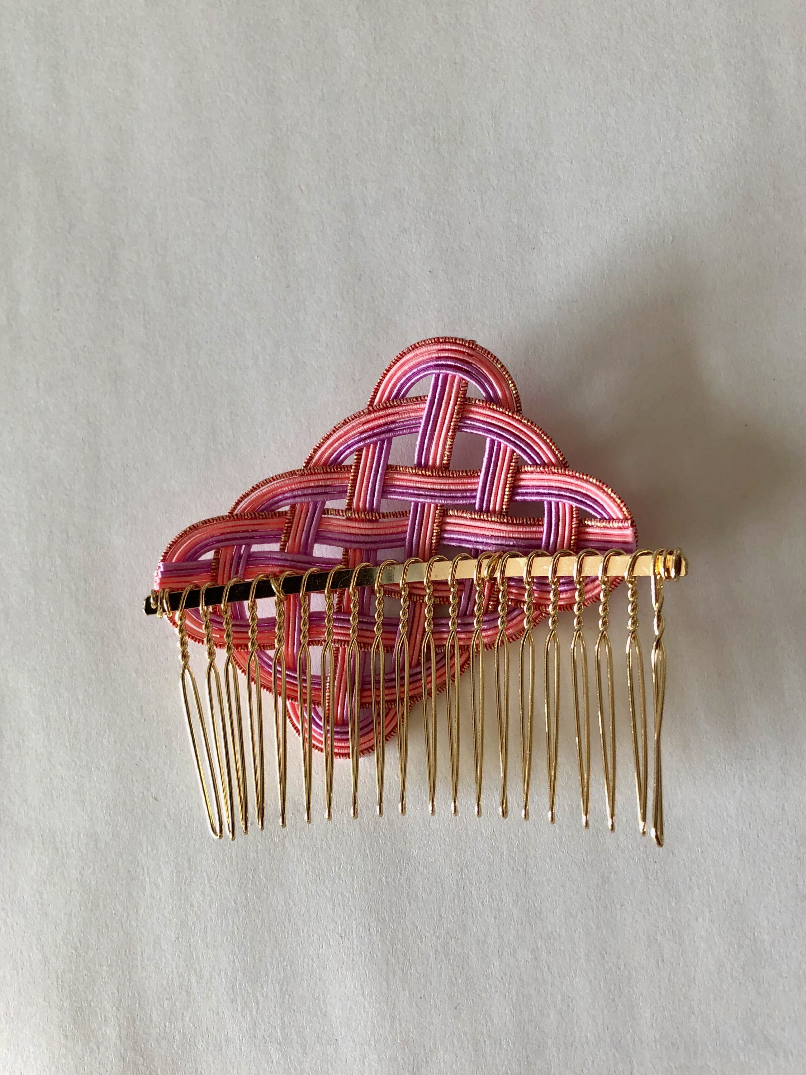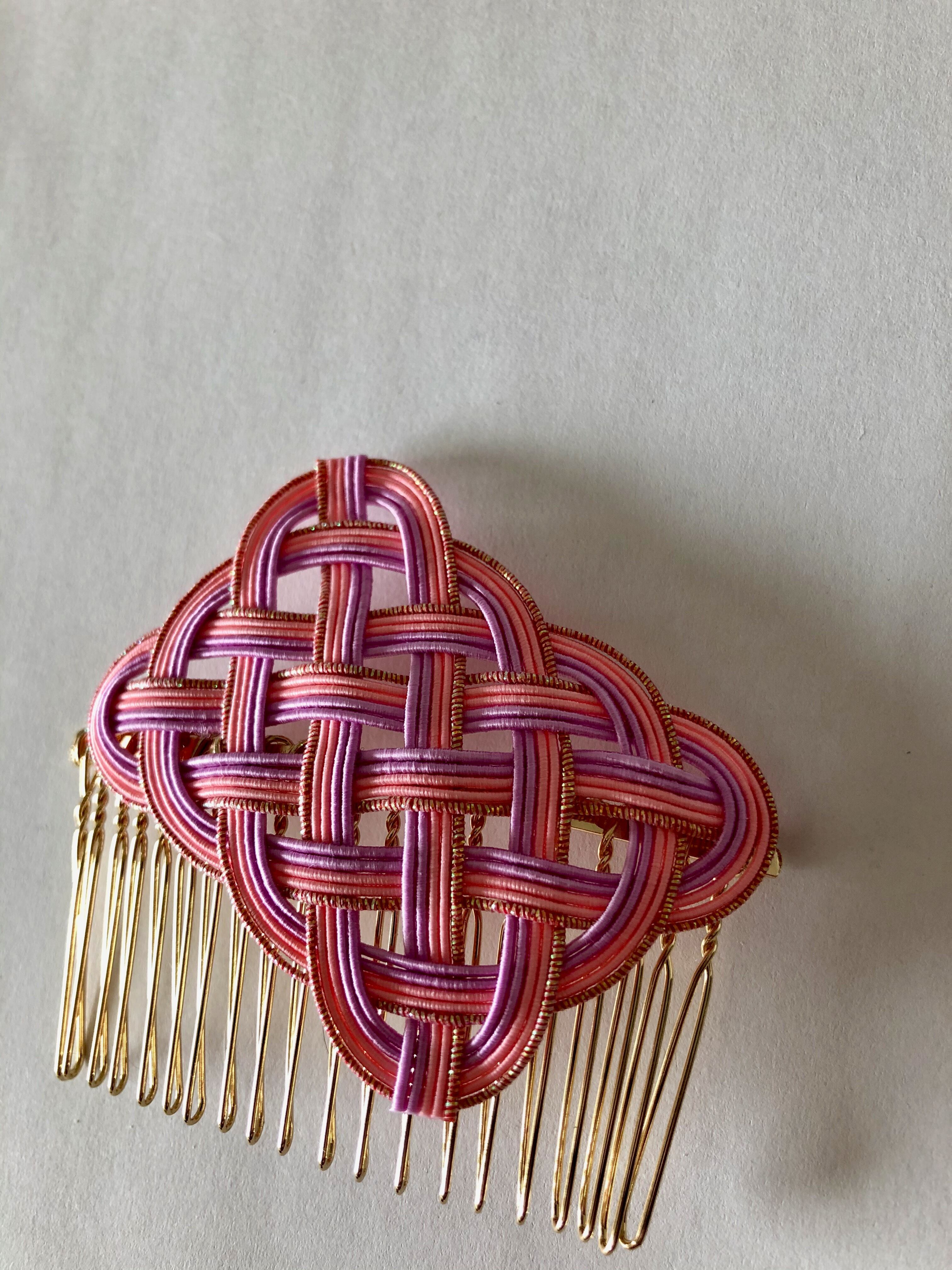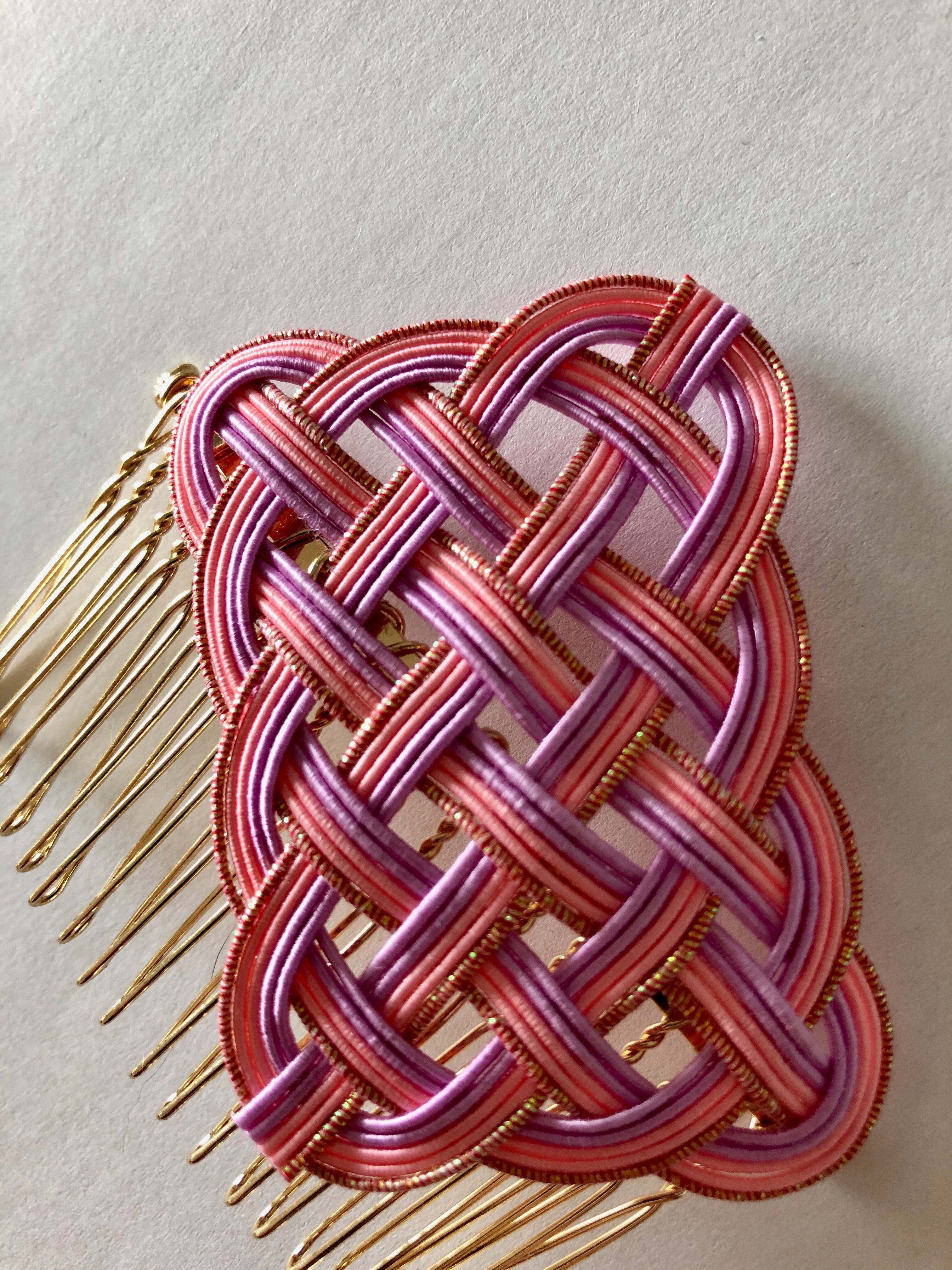 ピンク・紫・ラメの水引を、スクエアに編み込んだ髪飾り。