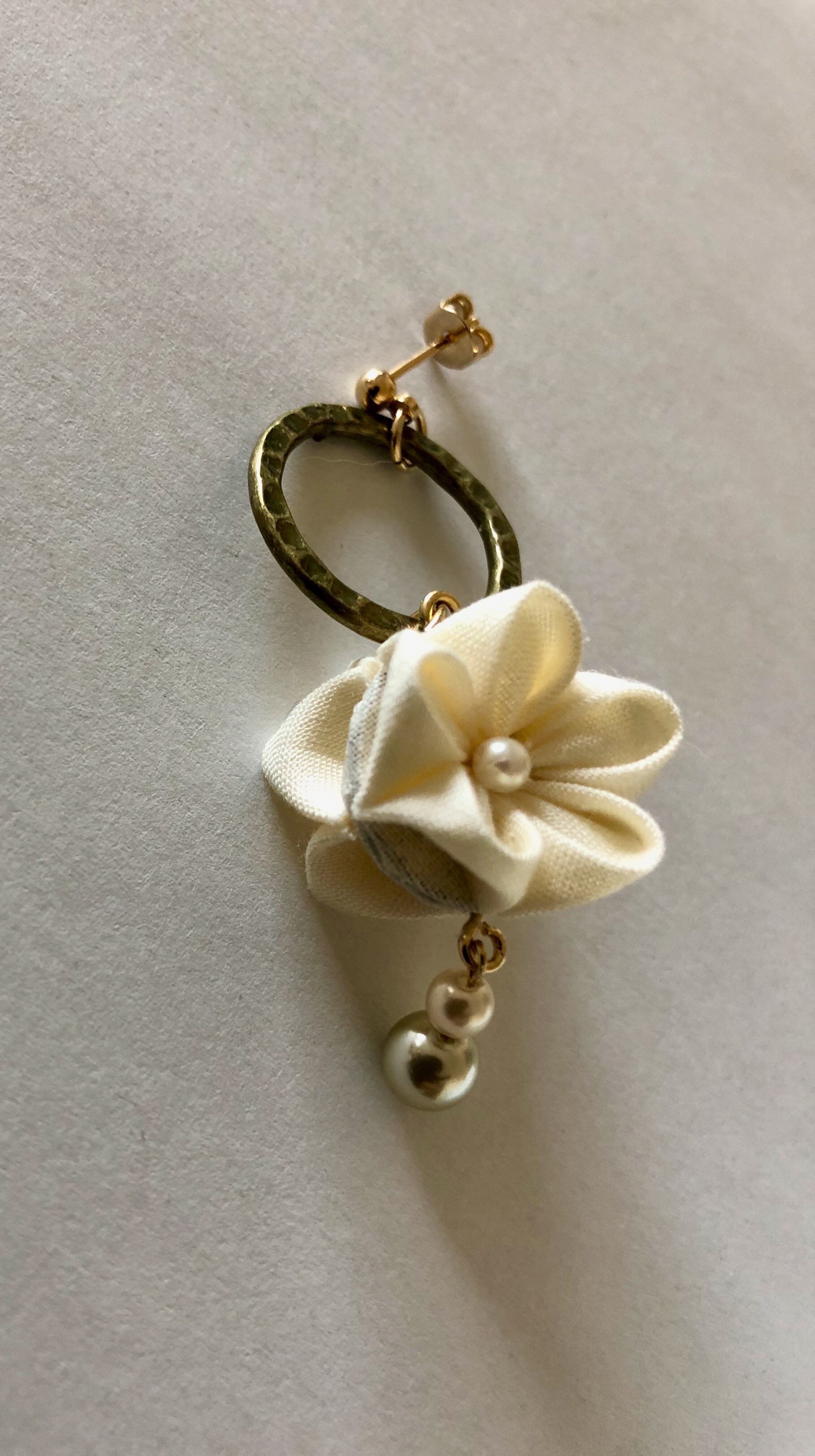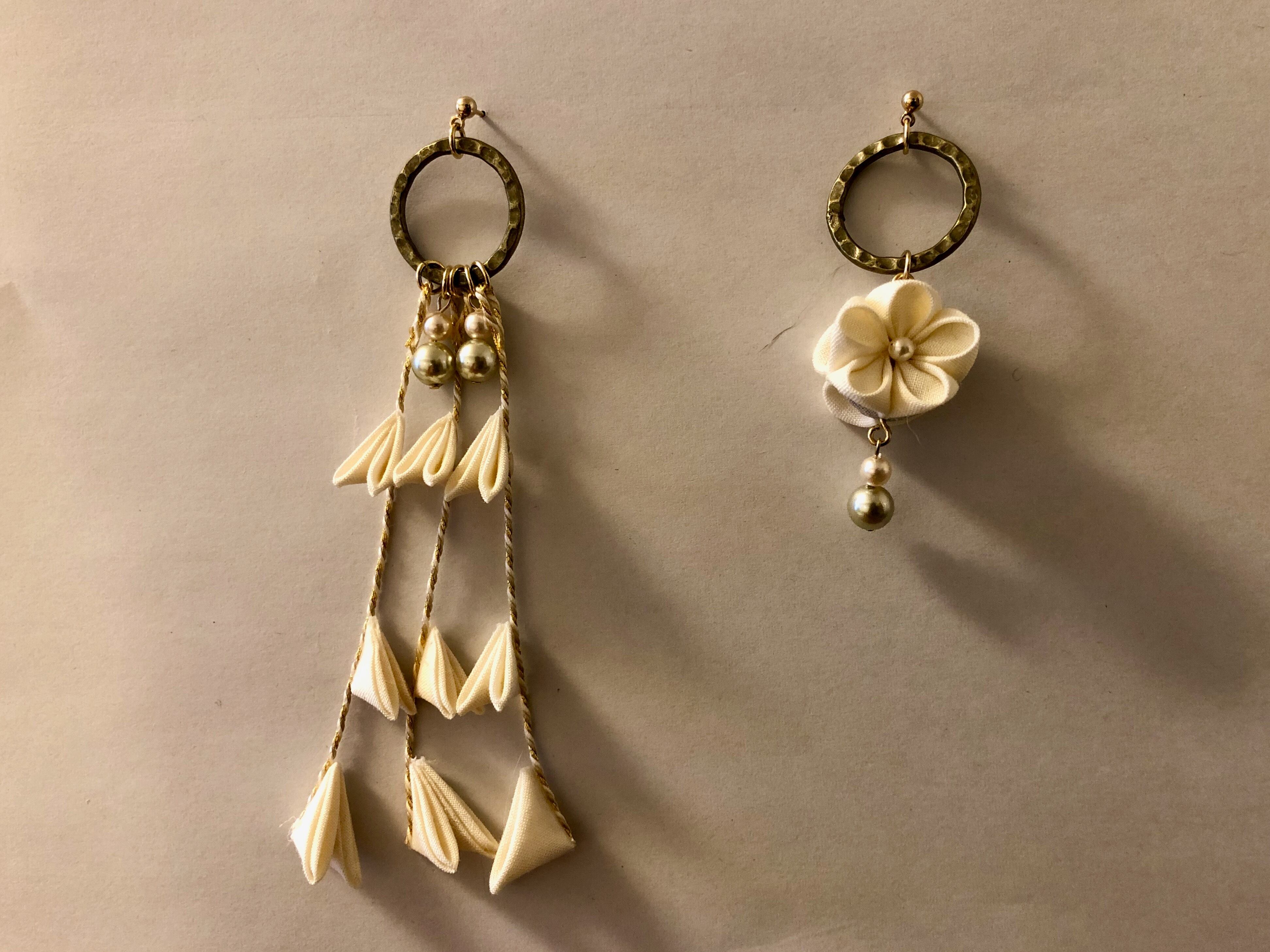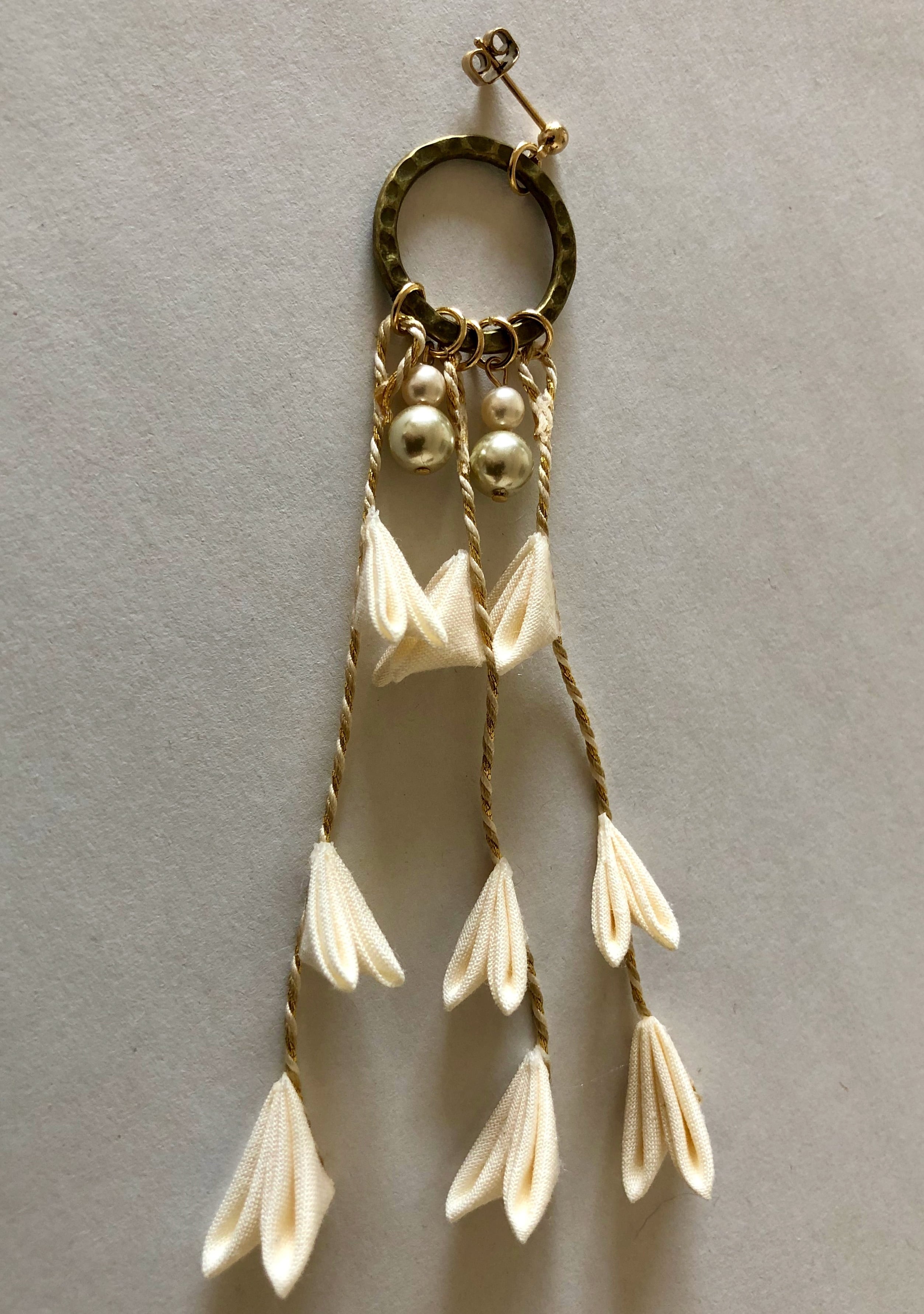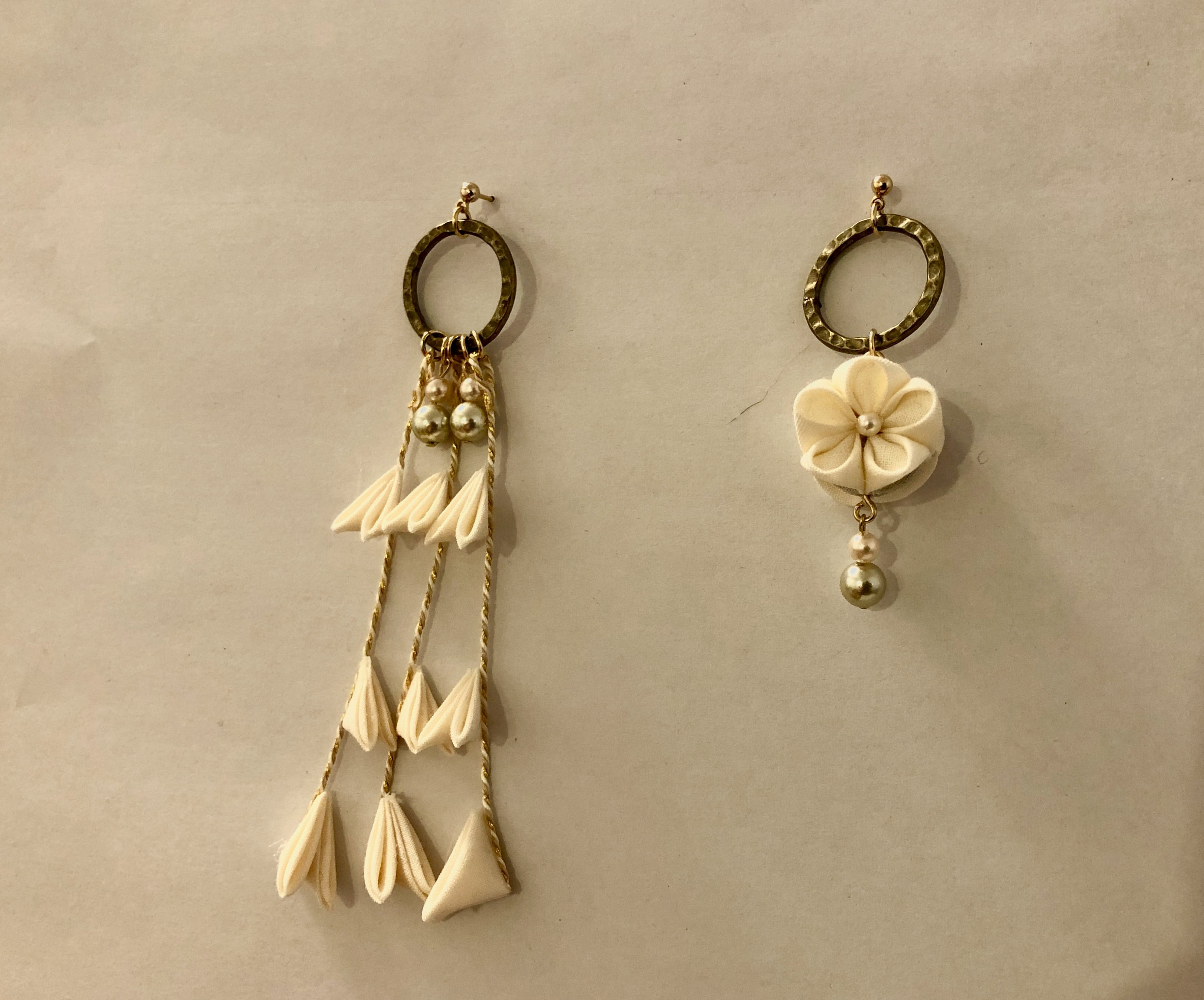 ◉白梅と柳下がりのつまみ細工のアンシンメトリーピアス
