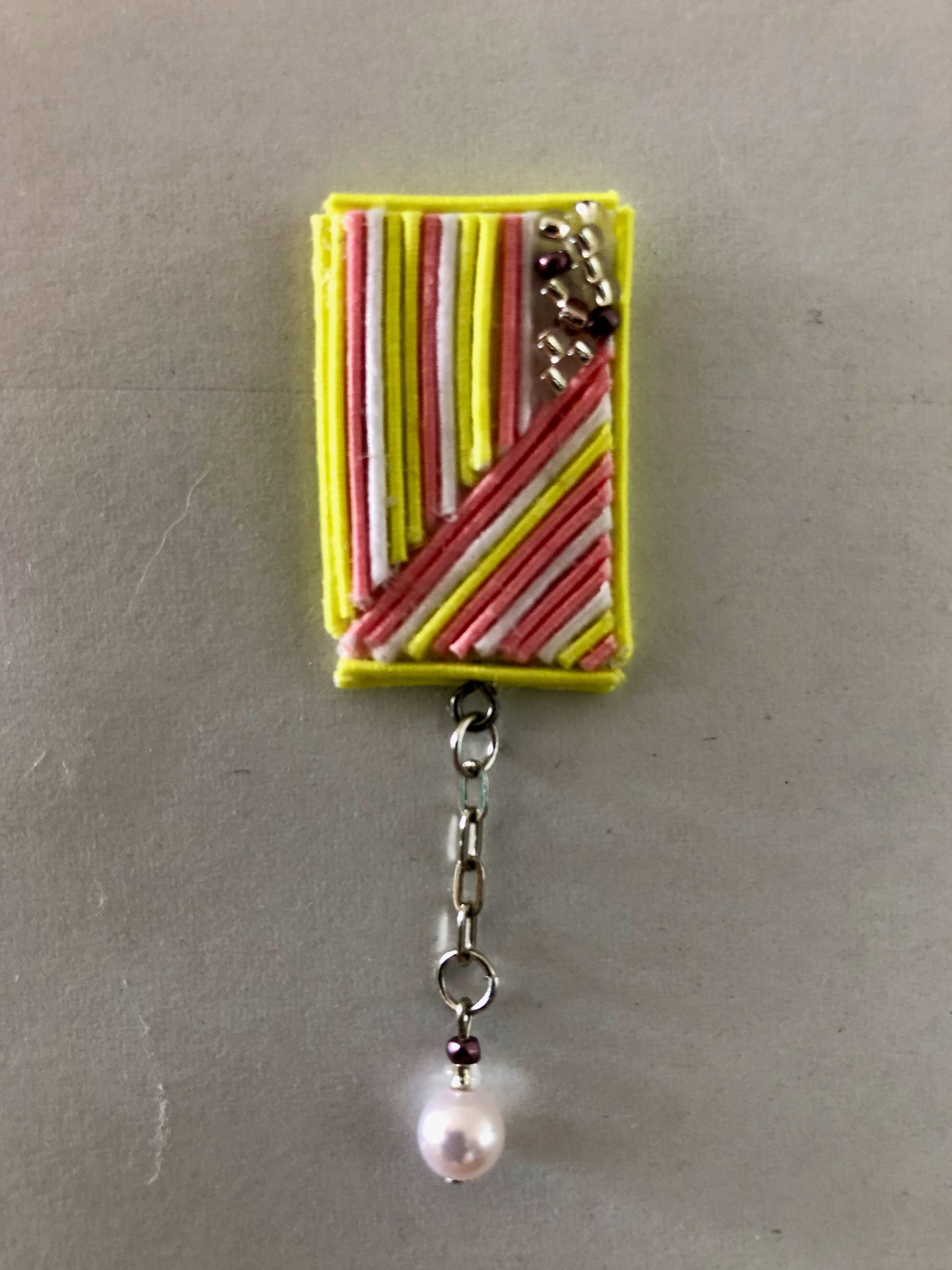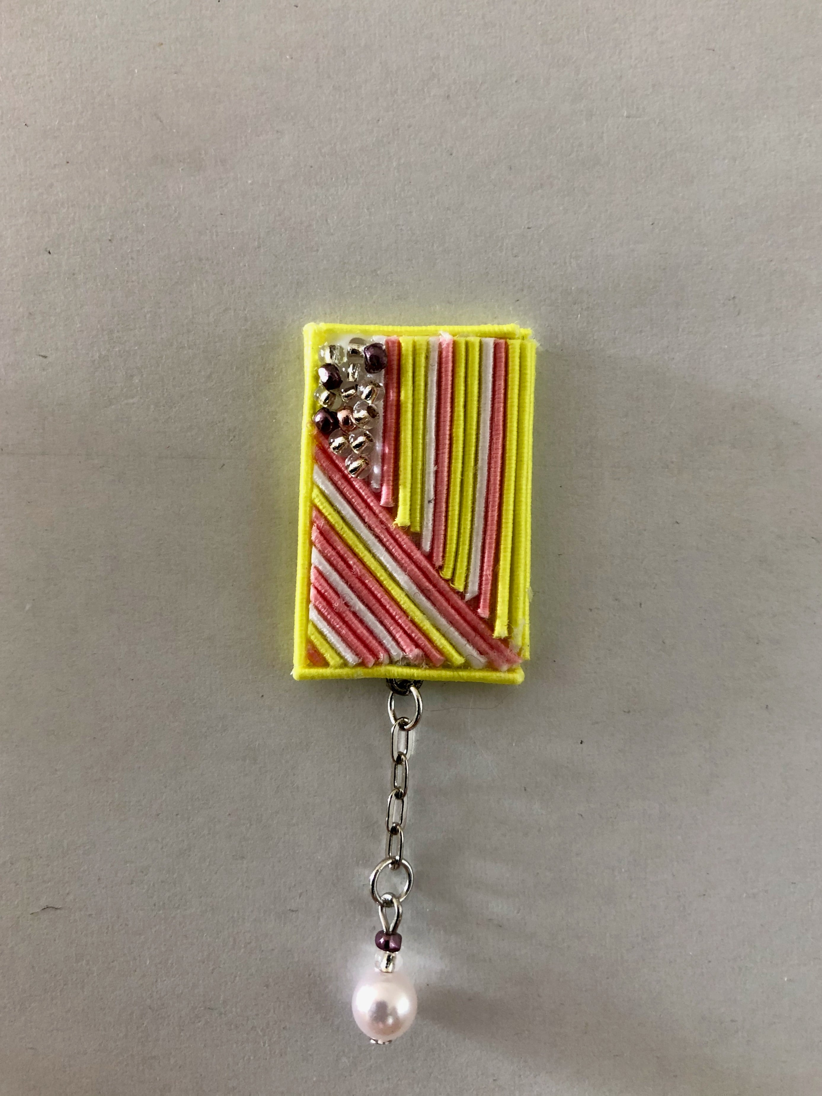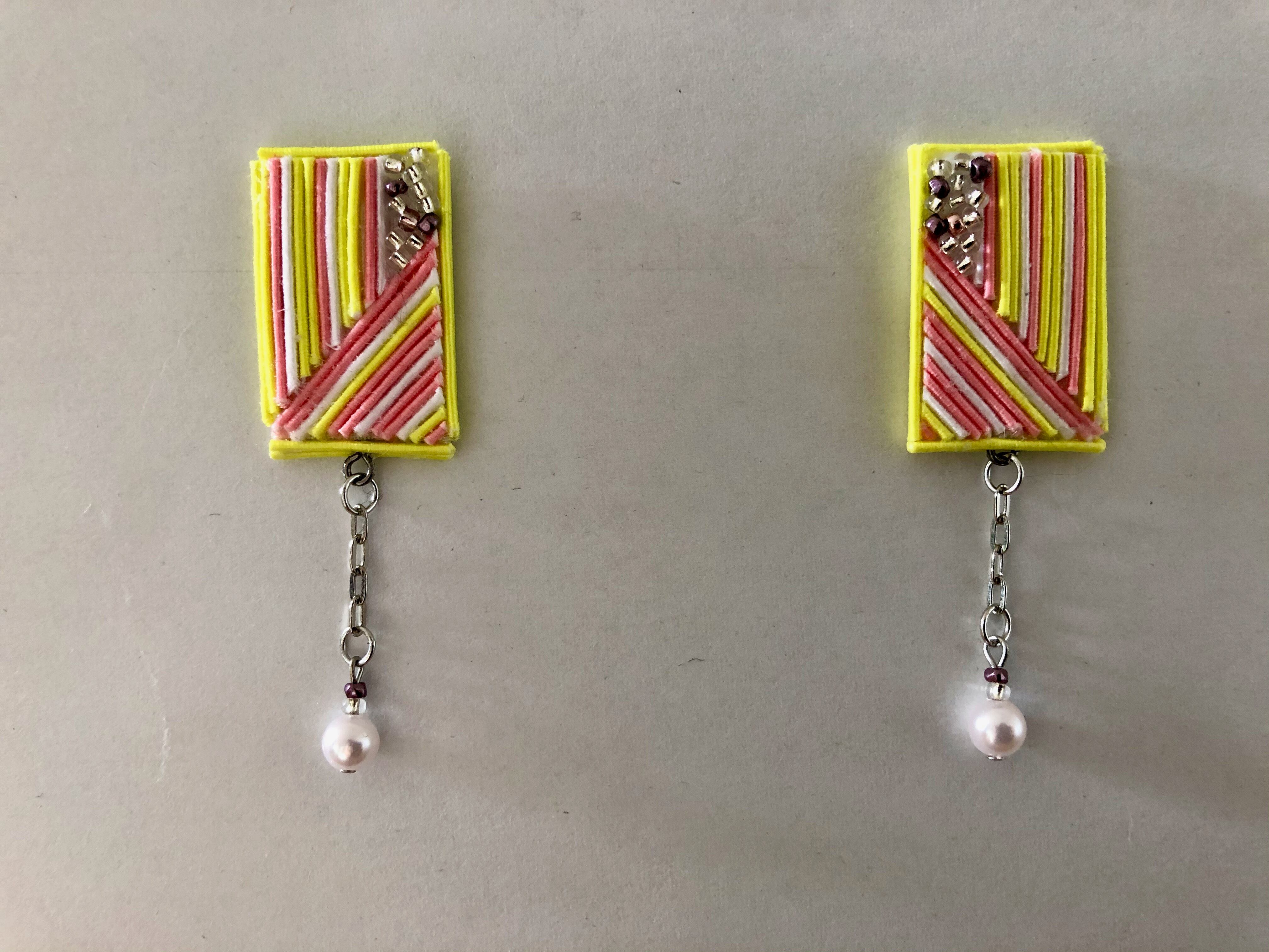 優しい色合いのピンク・白・黄色の配色を使い、ジオメトリックに水引を配したモチーフのピアス。
