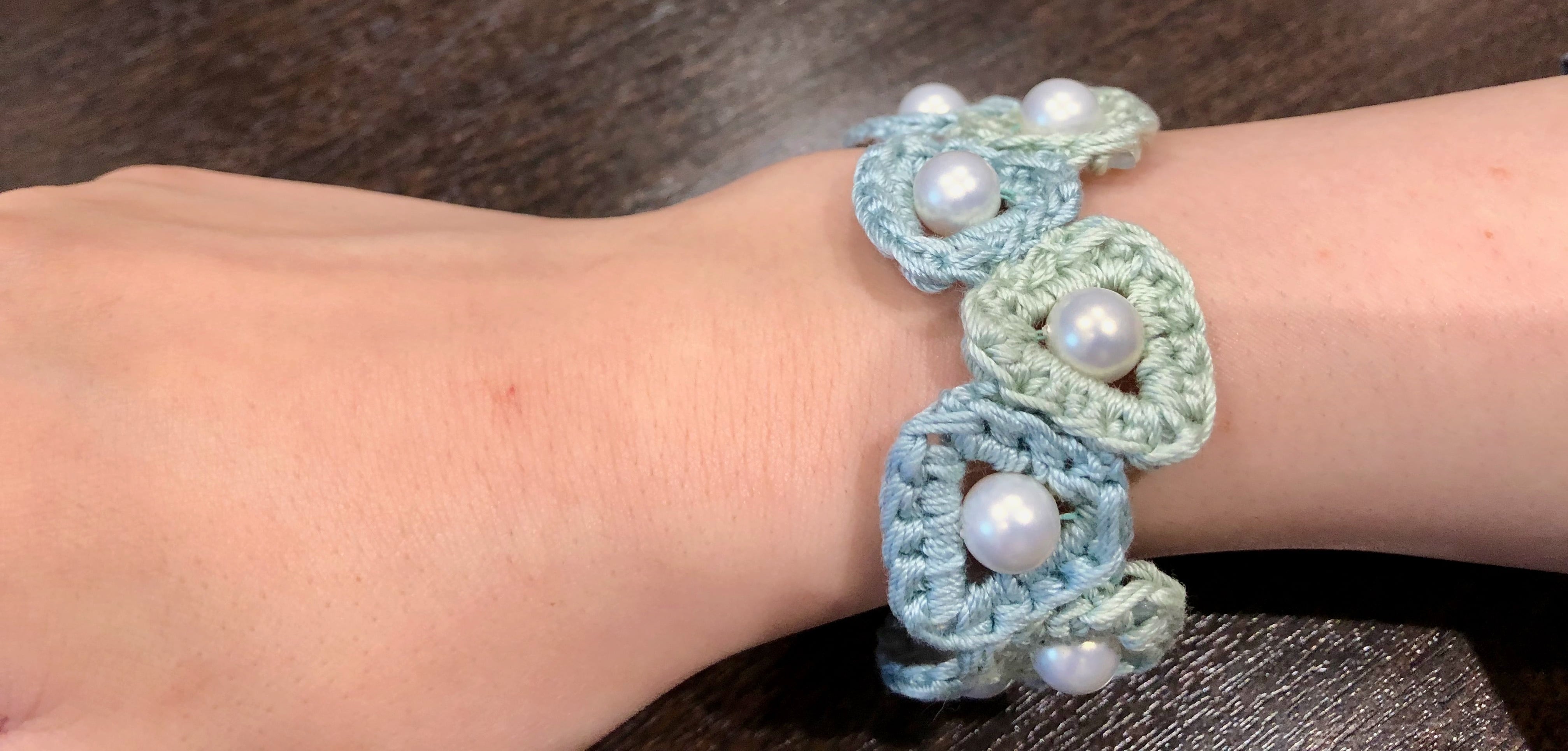 三角モチーフ の中にパールを縫い込んで、華やかさをプラス。