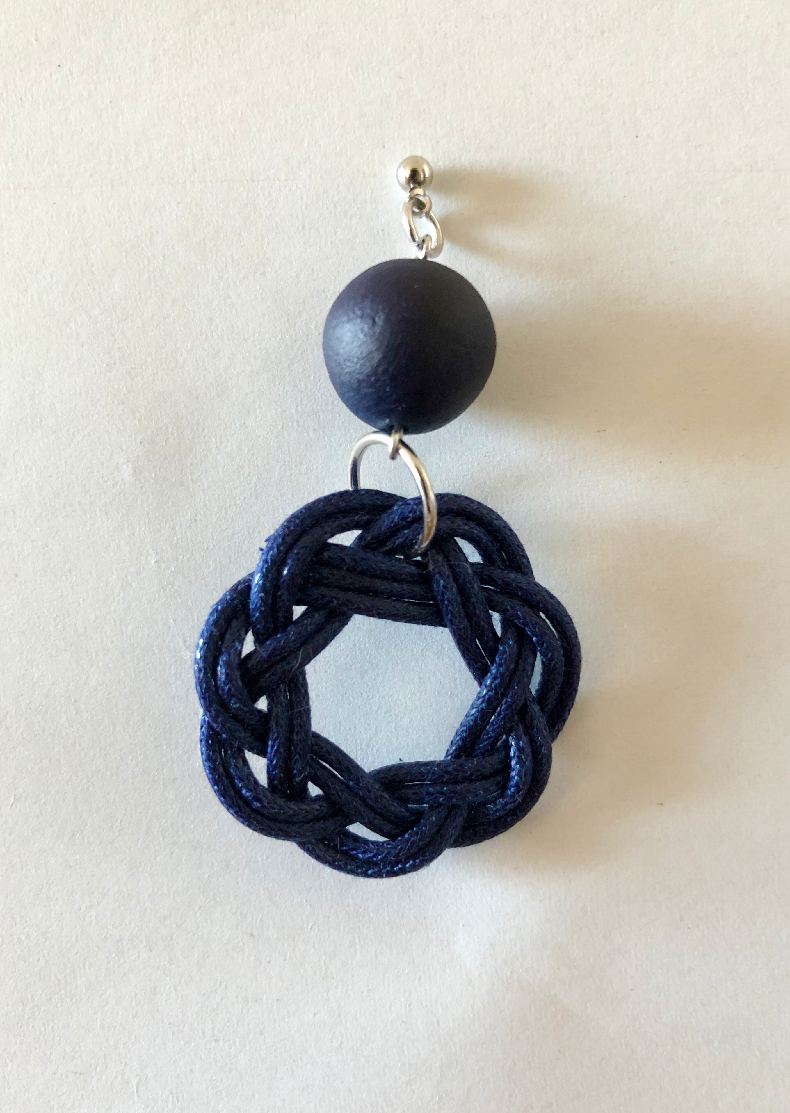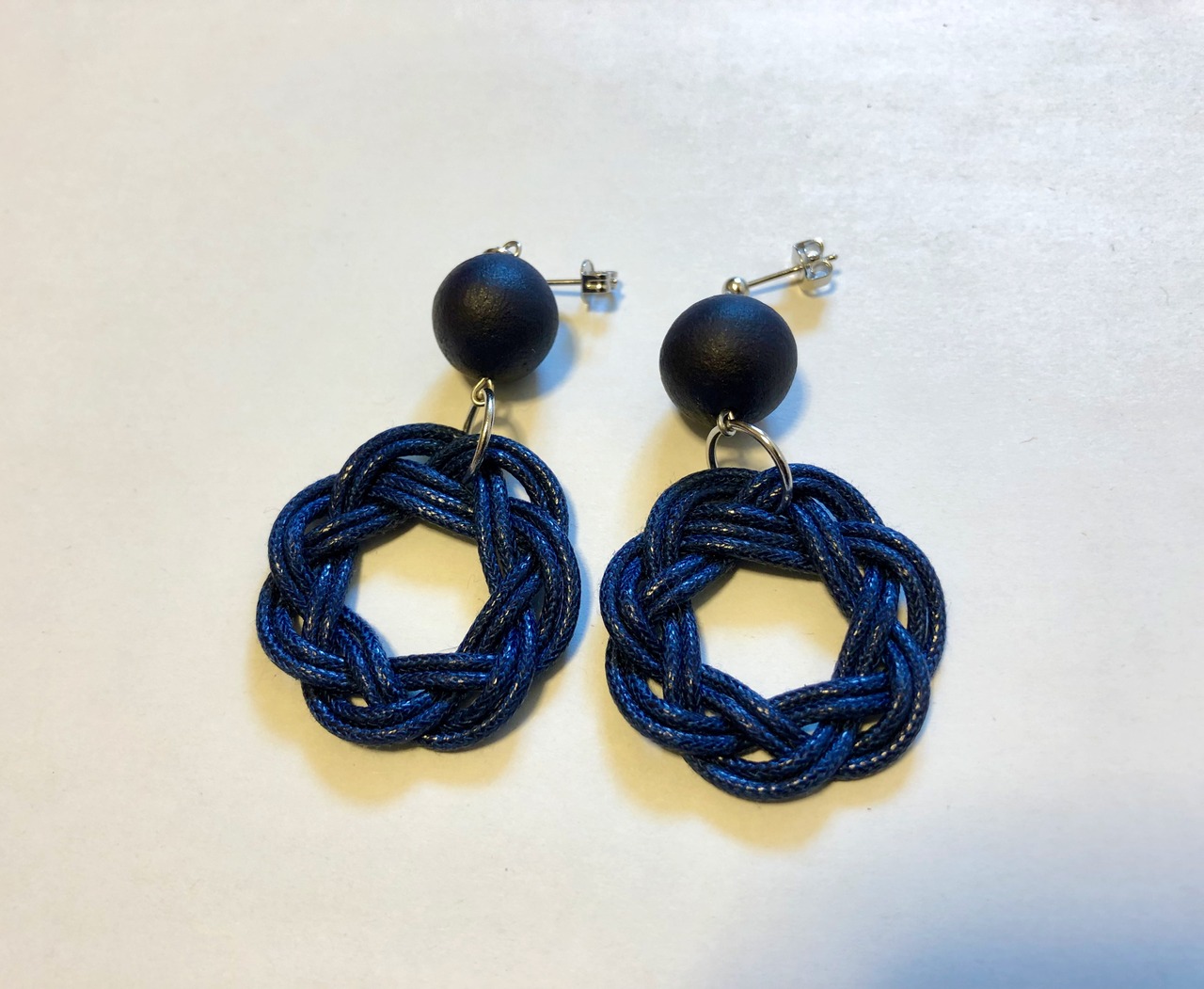 ネイビーのレザーコードをリング状に編み込んだピアスです。